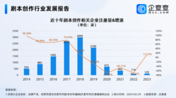 企查查數據顯示,我國現存劇本創作相關企業5589家。近十年,我國劇本創作相關企業注冊量呈上下波動態勢。2018年,我國劇本創作相關企業注冊量達2999家,同比增長12.24%,達近十年注冊量峰值。2019年—2022年,我國劇本創作相關企業注冊量分別達2190家、673家、362家、114家。2023年,我國劇本創作相關企業新增129家,同比增長13.16%。