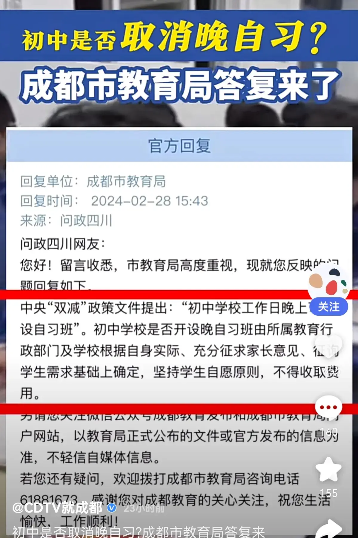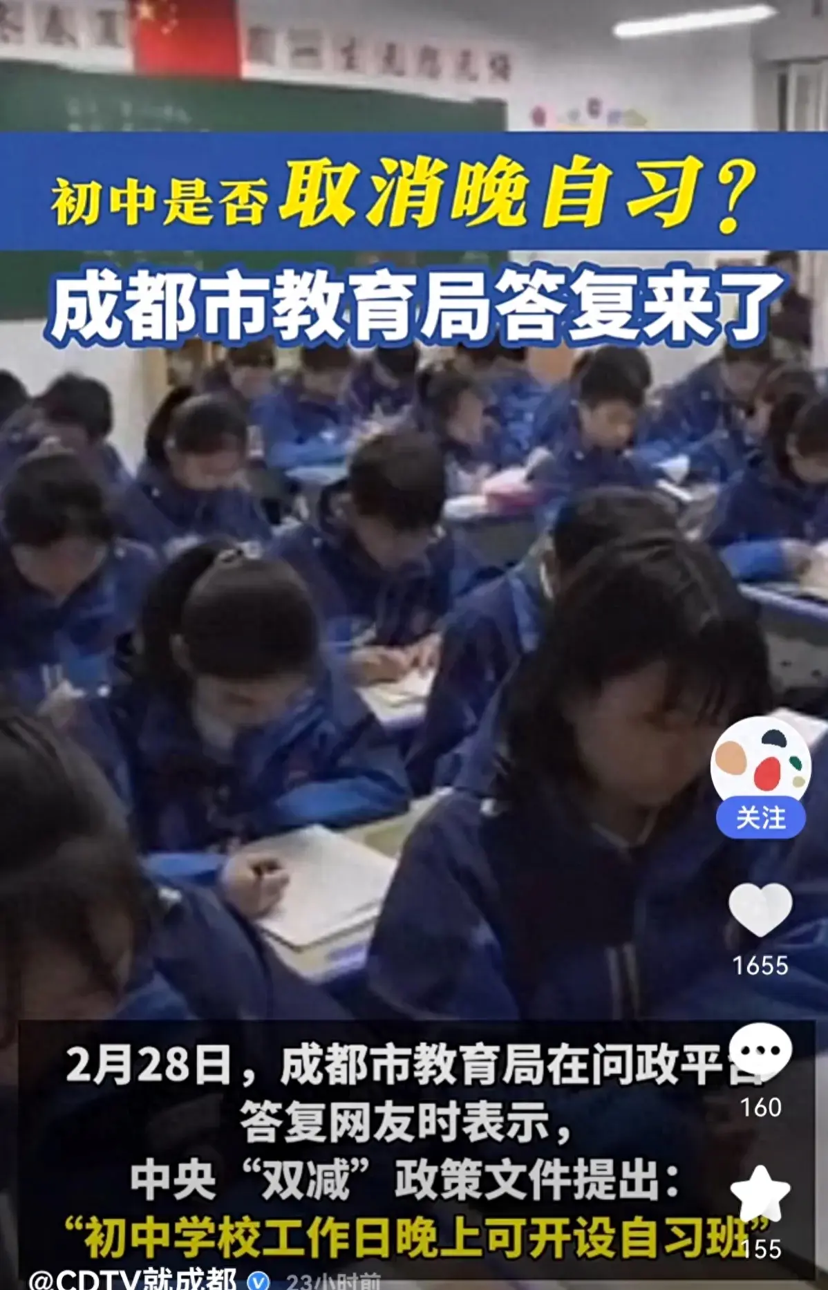 成都教育局回應初中取消晚自習