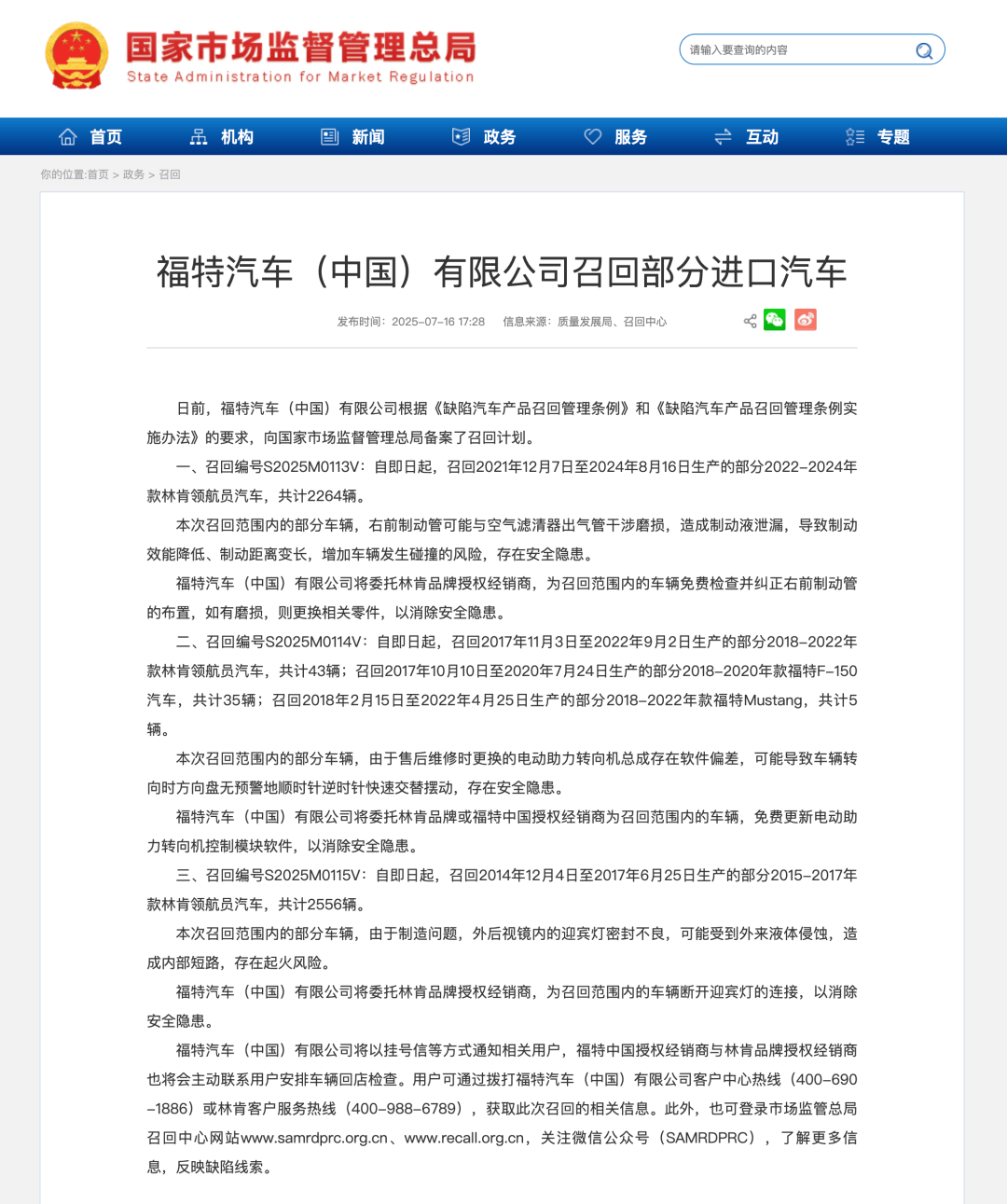 7月16日,福特汽車(中國)有限公司近日向國家市場監(jiān)督管理總局備案三項(xiàng)汽車召回計(jì)劃,涉及林肯領(lǐng)航員、福特F-150與Mustang等多款車型,共計(jì)4903輛。