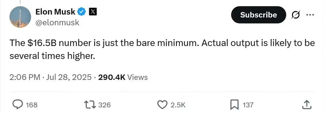 7 月 29 日消息,埃隆?馬斯克昨日在 X 平臺上表示,三星電子在文件中披露的 165 億美元(IT之家注:現匯率約合 1183.87 億元人民幣)僅是雙方交易的最低金額,實際金額可能會達到這一水平的數倍。
