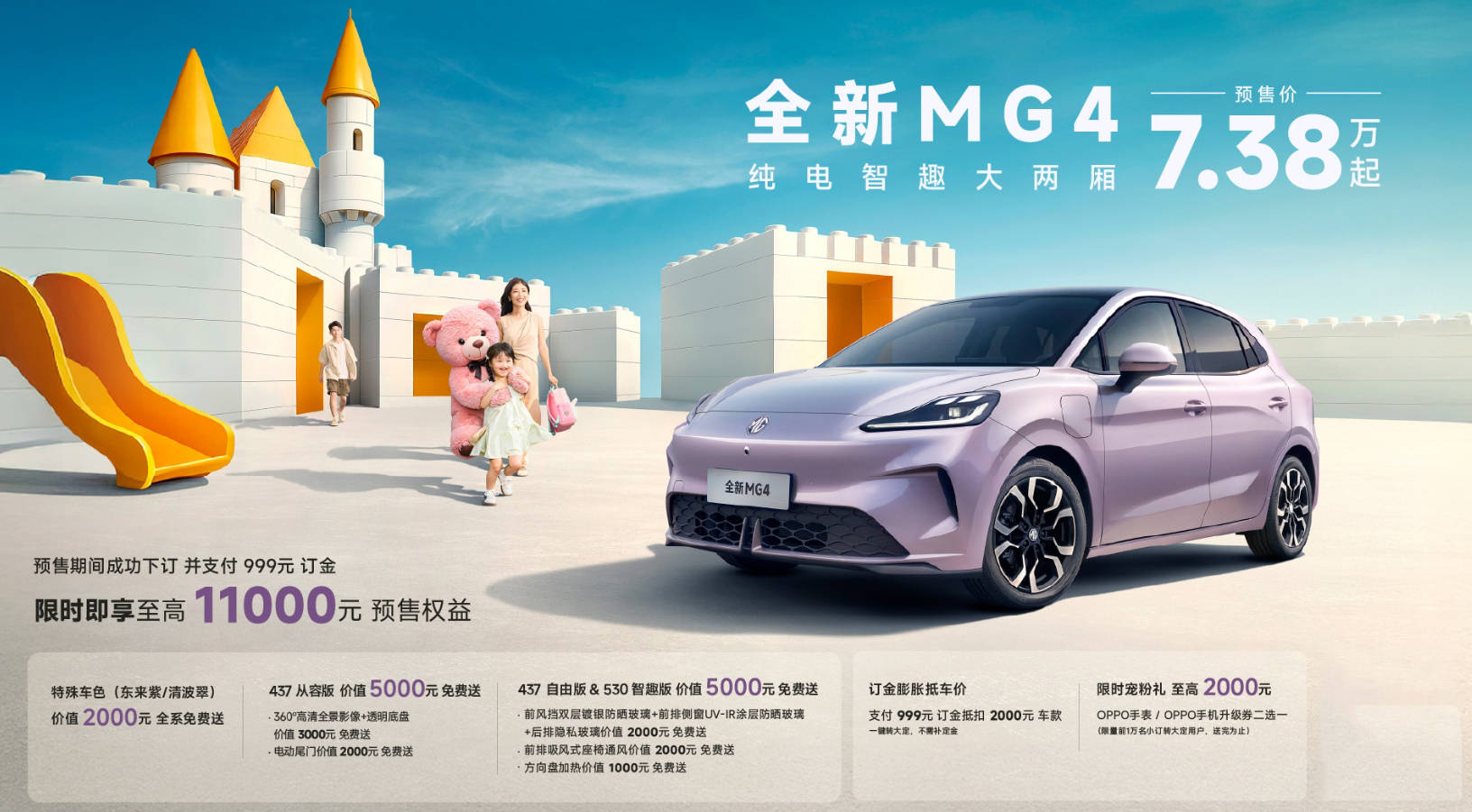 8月5日,全新MG4正式開啟預售,新車共推出4款車型,預售價區(qū)間為7.38-10.58萬元。作為MG全面發(fā)力新能源領域的重磅車型,新車基于上汽E3純電架構(gòu)平臺打造,并且全新MG4率先搭載MG×OPPO智行車機互聯(lián)系統(tǒng)。與此同時,新車還將推出半固態(tài)安芯版本車型,搭載半固態(tài)電池,將于9月公布價格,年內(nèi)批量交付。此外,預售期間成功下訂,并支付999元訂金限時即享至高11000元的預售權(quán)益。