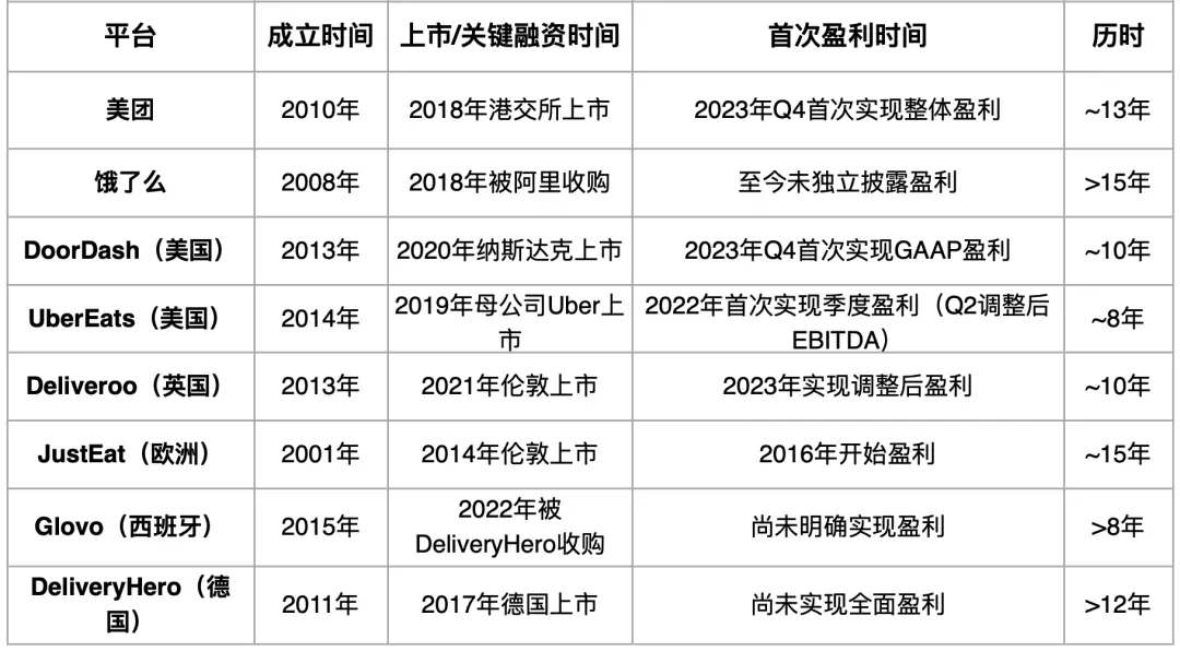 從行業規律看,全球外賣平臺需經歷多輪高額補貼、長期運力建設(自建或深度綁定配送團隊),才能逐步實現規模效應并攤薄成本,盈利周期普遍長達8~15年,且高度依賴母體資金持續輸血。
