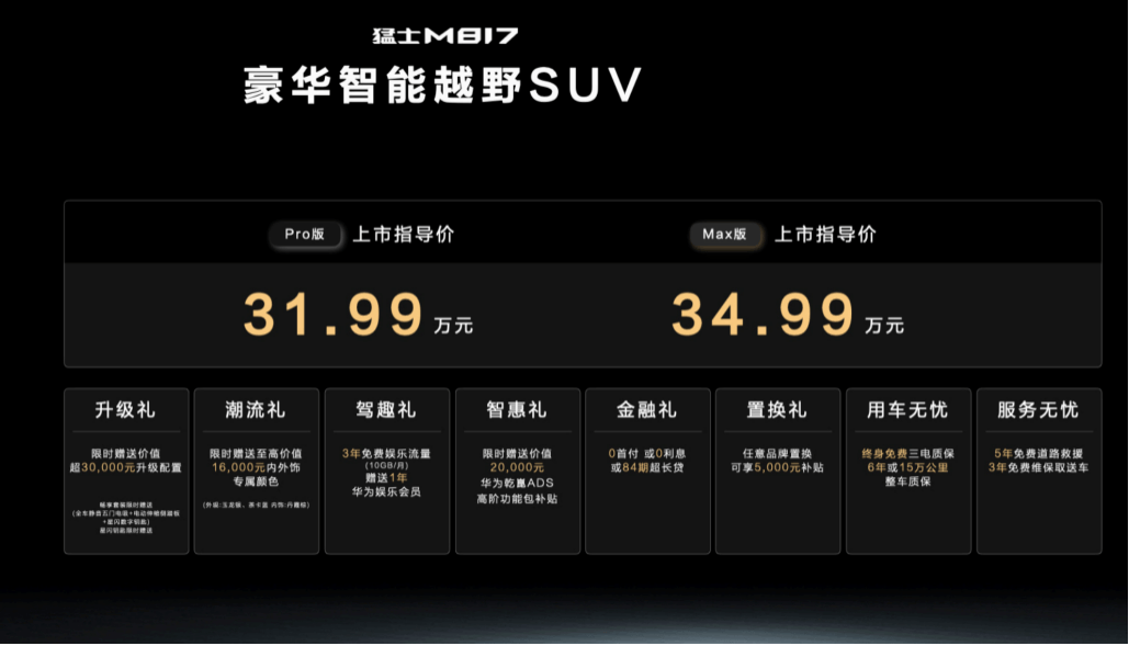 8月17日,東風(fēng)猛士M817上市,共推出兩個(gè)版本,售價(jià)分別為31.99萬元和34.99萬元。猛士M817是東風(fēng)猛士科技與華為合作打造的一款硬派越野車型,采用非承載式車身結(jié)構(gòu),搭載華為乾崑ADS 4智駕和鴻蒙座艙5,將越野車與智能化融為一體。
