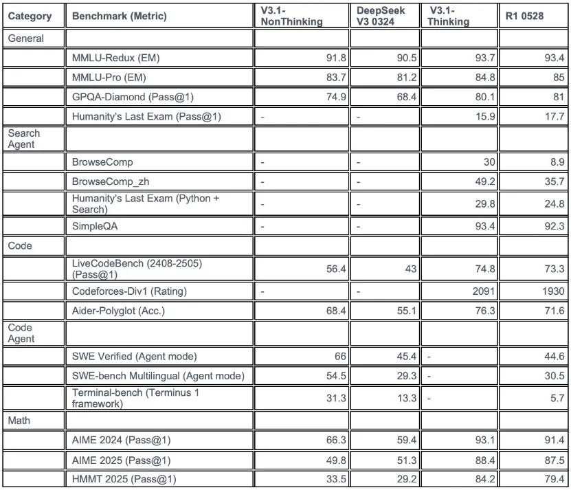·更高的思考效率:DeepSeek-V3.1-Think在回答質量上可與R1-0528媲美,同時響應速度更快。