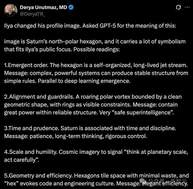 這張圖是土星的北極六邊形風(fēng)暴,它蘊(yùn)含的多種象征意義,與Ilya一貫公開關(guān)注的焦點(diǎn)十分契合。
