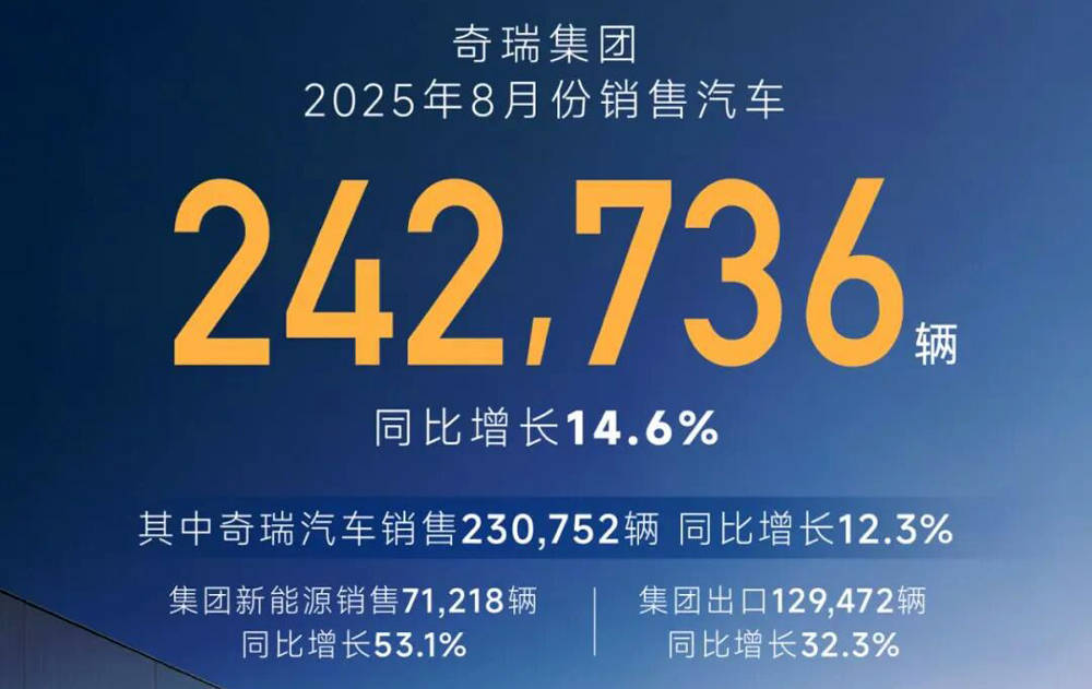 根據奇瑞集團公開的銷量顯示,集團8月銷量242736臺,同比增長14.6%,其中,新能源車月銷71218臺,同比增長53.1%;海外出口129472臺,同比增長32.3%。今年1-8月累計銷量超172萬臺,同比增長14.5%,其中,海外出口798804臺。