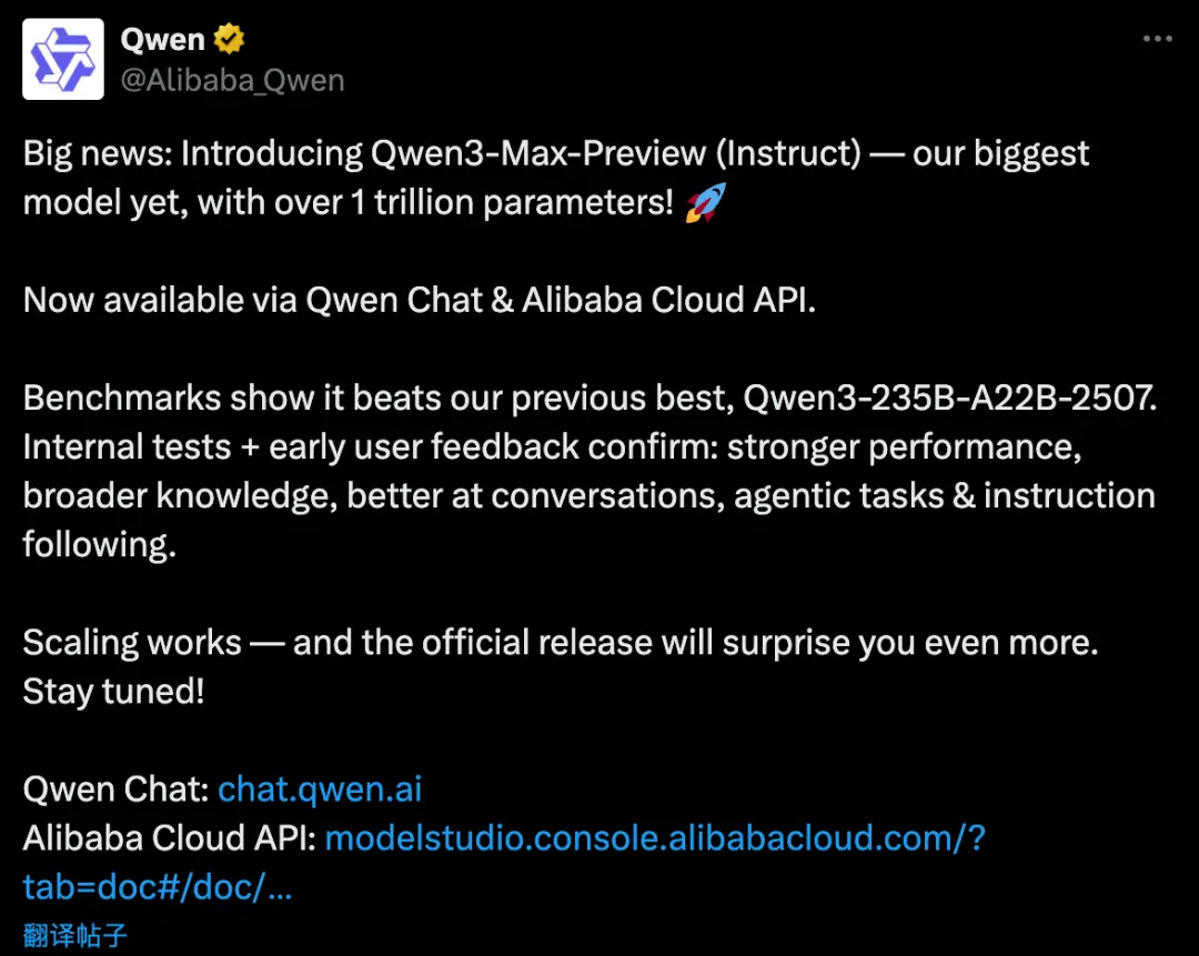 昨天Anthropic剛玩了一手“極端措施”,阿里深夜一波大的直接反手一記重拳——推出其史上最大的模型,Qwen3-Max-Preview,參數量足足超1萬億!