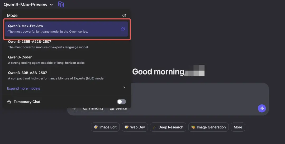 目前,Qwen3-Max-Preview已經可以體驗,只需在模型下拉選項中選擇即可: