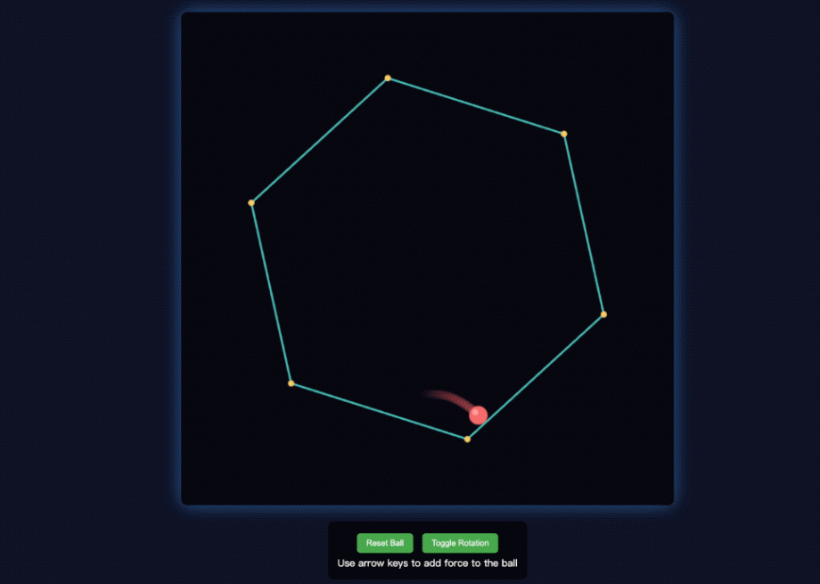 可以看到,小球會基于物理規律在六邊形的框內運行;并且在用“向上鍵”去給小球一個力時,它也能立即做出響應。