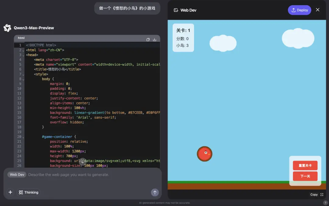 最后,我們再讓Qwen3-Max-Preview生成一個小游戲: