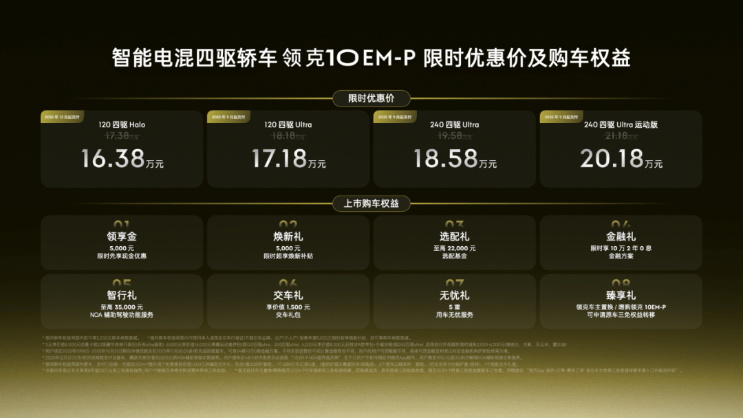 從定價(jià)與定位上來看,領(lǐng)克10 EM-P用“價(jià)值錨點(diǎn)”直面挑戰(zhàn)合資與新勢(shì)力。16.38萬—20.18萬元的限時(shí)優(yōu)惠,幾乎打到中高端電混轎車的腹地。對(duì)比比亞迪漢DM-i的高配、問界M7增程的入門版的售價(jià)與配置,領(lǐng)克10 EM-P在四驅(qū)、智駕和豪華配置上明顯“堆料”,實(shí)際形成的是30萬級(jí)別的體驗(yàn),下探至20萬區(qū)間。這樣的策略,本質(zhì)是通過“高舉高打—下壓定價(jià)”的方式,塑造品牌的價(jià)值錨點(diǎn)。
