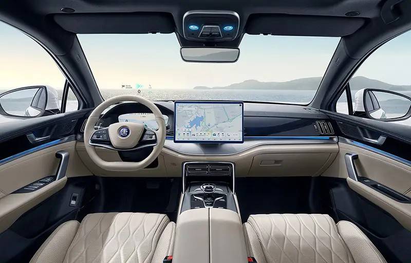 內飾部分,新車配備12.3英寸全液晶儀表盤并搭配雙輻式的多功能方向盤,中控臺配備15.6英寸的2.5K自適應選裝屏。值得注意的是,新車型取消了中控通道上的電子擋把,調整成了電子懷擋。配置方面,根據不同車型,新車將配備車載冰箱、手機無線充電、方向盤加熱、智能香氛、前排座椅按摩、丹拿音響等配置。智能化方面,新車將擁有激光雷達可選,搭配天神之眼B輔助駕駛系統,非激光雷達版則配備天神之眼C輔助駕駛系統。