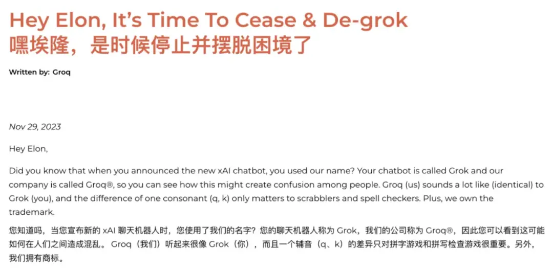 還有他們的名字——Groq和Grok看起來很像不是么?他們甚至就此“喊話”過埃隆馬斯克,痛斥其“剽竊”自己的名字。