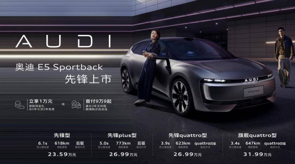 作為奧迪全新電動設計語言在中國的首發力作,E5 Sportback不僅在設計、智能、駕控等方面全面進階,更以極具競爭力的定價策略,重新定義豪華電動市場的價值標準。