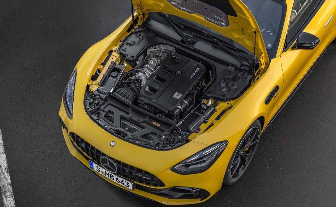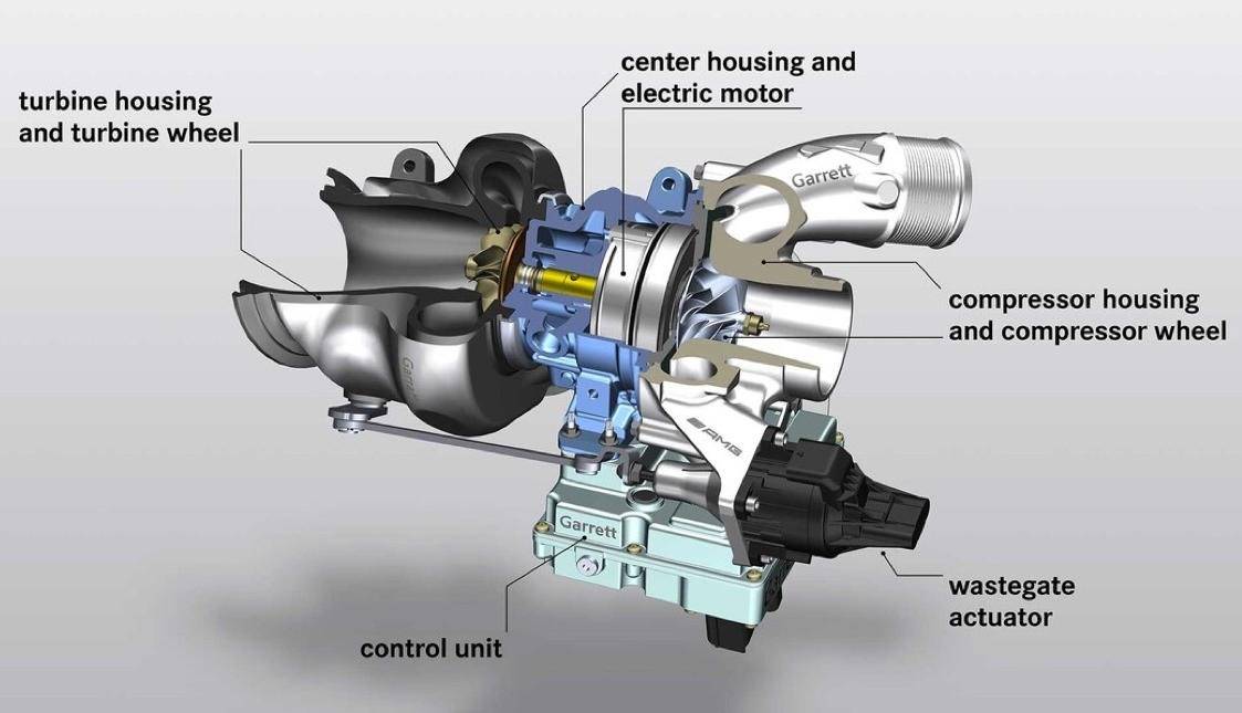 AMG GT 50所搭載的2.0T發動機,與AMG A45 S的發動機一致,但經過重新標定,首先使用了源自F1技術的電動渦輪,與傳統渦輪依靠廢氣推動不同,渦輪集成了一臺電機,直接驅動渦輪軸。在低轉速廢氣壓力不足時,電機可瞬間將渦輪轉速提升至169000轉/分鐘,消除了渦輪遲滯現象。當然電機也能在收油時繼續維持渦輪轉速,確保再次加速時動力爆發。