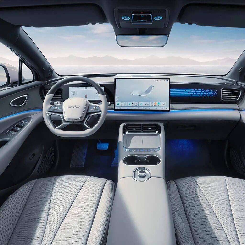 外觀方面,前臉最有標(biāo)識性的細(xì)節(jié)就是運用了分體式前大燈的設(shè)計,配合可編程燈語系統(tǒng),讓車輛在夜間具備獨特的辨識度。側(cè)面采用隱藏式門把手和懸浮式車頂設(shè)計,C柱位置的閃電狀裝飾條與20英寸低風(fēng)阻輪轂形成呼應(yīng)。車尾造型簡潔,使用了貫穿式尾燈,猶如波浪般的曲線也是海洋網(wǎng)家族經(jīng)典的尾燈樣式,EV和DM-i僅是在尾標(biāo)有所差異,同時可見天神之眼的標(biāo)識。其長寬高分別為4810/1920/1675 mm,軸距為2820mm。在同級別中,車身比零跑C10要長,但軸距比它短,主要聚焦后排乘坐體驗,后排腿部空間達(dá)980mm,屬于同級罕見水平。