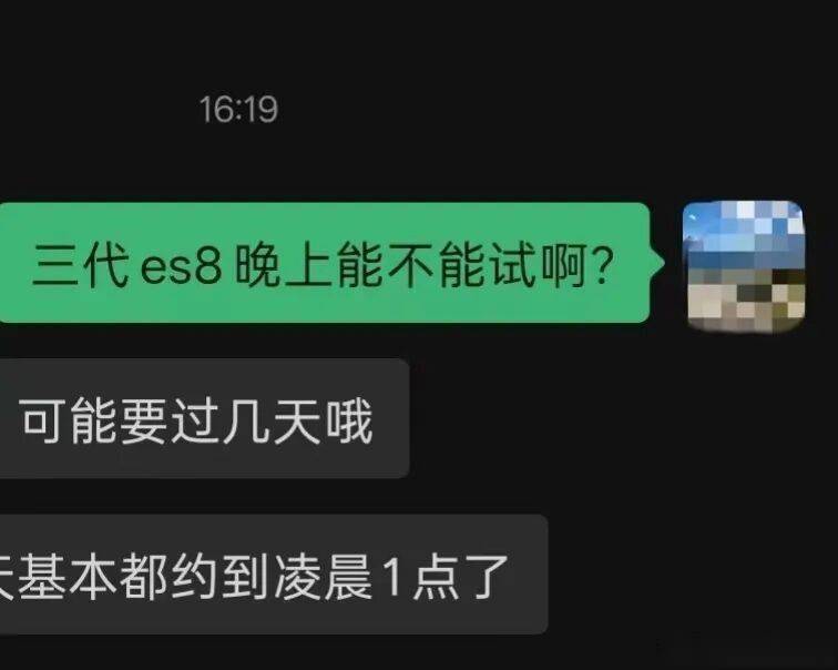 9月10日,蔚來全新ES8開啟全國試駕,蔚來汽車用戶運營負責人楊波于當日下午通過個人微博發(fā)布通知,稱從今晚起推遲閉店。根據(jù)他曬出的聊天記錄,蔚來門店近期約試駕已約到凌晨1 點。