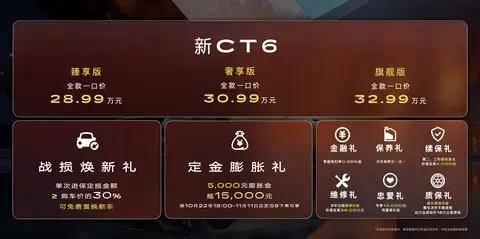 價格破冰的同時,新CT6構建起“限時+長效”的權益矩陣:支付5000元定金抵15000元購車款(相當于直接優惠1萬元)、0.99%超低利率金融方案、次年保養買一送一、10000元再置換補貼等政策,形成從購車到用車的全周期價值守護。