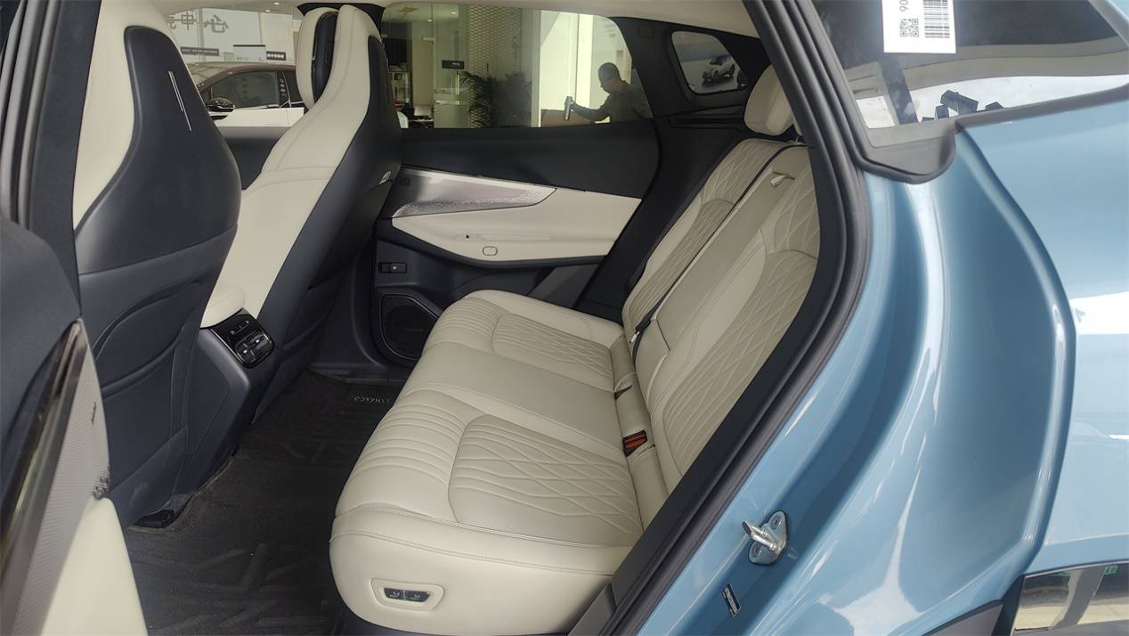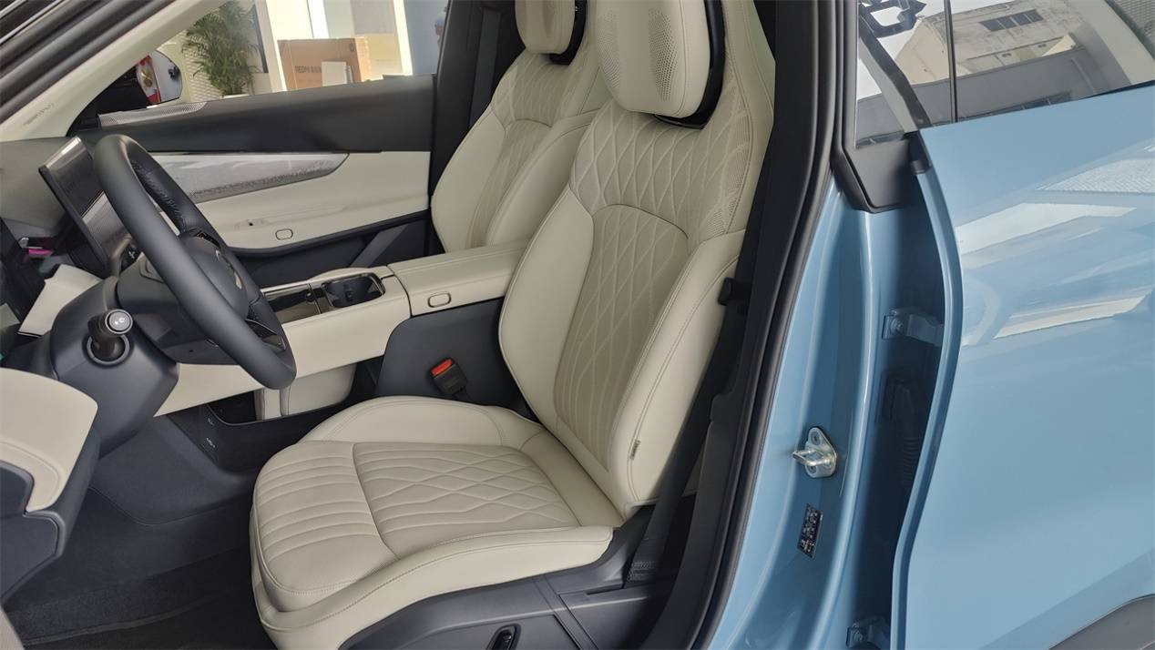 前排座椅的配置還是很給力的。除了入門配置使用仿皮之外,前排座椅都是真皮材質(zhì),雖然面料的手感不算特別高級(jí),但是柔軟度和順滑度還是不錯(cuò)的,而且都帶有四向腰托、按摩、副駕腿托;全系前排座椅都帶有加熱、通風(fēng)和記憶功能。15.98萬(wàn)的入門配置(160長(zhǎng)續(xù)航Max)的仿皮手感也不算差,但是味道要比真皮更大一些。