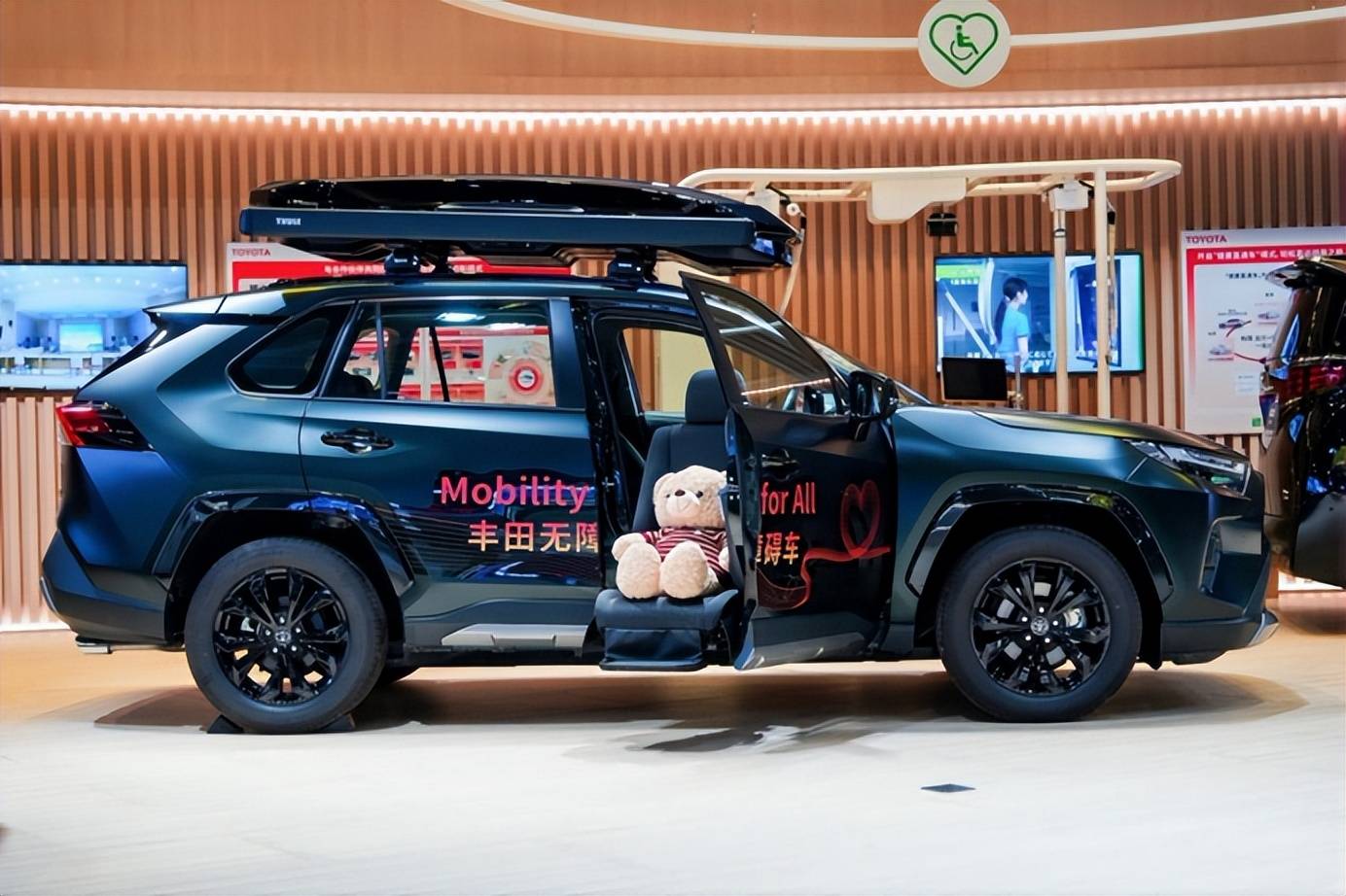 再比如本次進博會上的RAV4 榮放(福祉試作版),其面向受眾規模更大的SUV領域,在副駕駛座位搭載了日本同步開發的超薄升降旋轉座椅,這對于家里有行動不便人群的用戶而言,簡直就是福音,無論是上車或下車,都將更加容易。