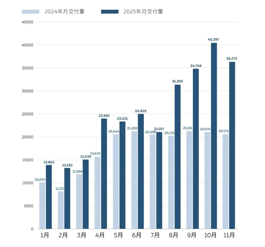 小米汽車11月保持穩(wěn)定輸出,交付量持續(xù)超過4萬臺(tái),已連續(xù)三個(gè)月維持在這一水平之上。穩(wěn)定的交付表現(xiàn)反映出其制造與供應(yīng)鏈體系的日趨成熟。