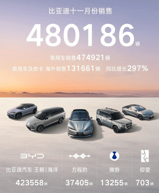 比亞迪11月共銷售480186輛,創(chuàng)下年內(nèi)新高。其中海外銷售突破13萬輛,同比增長297%,同樣創(chuàng)下歷史新高。今年1-11月,其累計(jì)銷售已突破418萬輛。