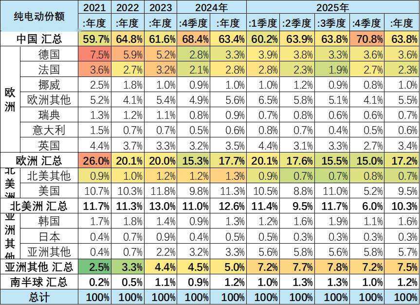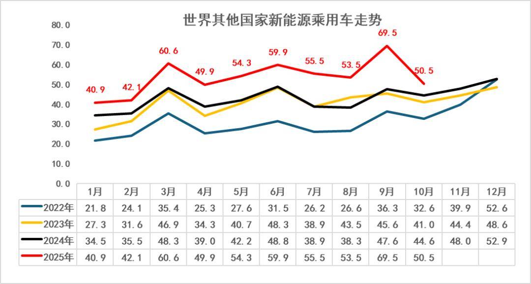 中國在世界純電動車市場份額表現(xiàn)相對平穩(wěn),2022年升到64.8%的份額;2023 -2024年的份額低于65%的份額水平;2025年1-10月中國在世界純電動車市場份額63.8%份額,較2024年份額基本持平。