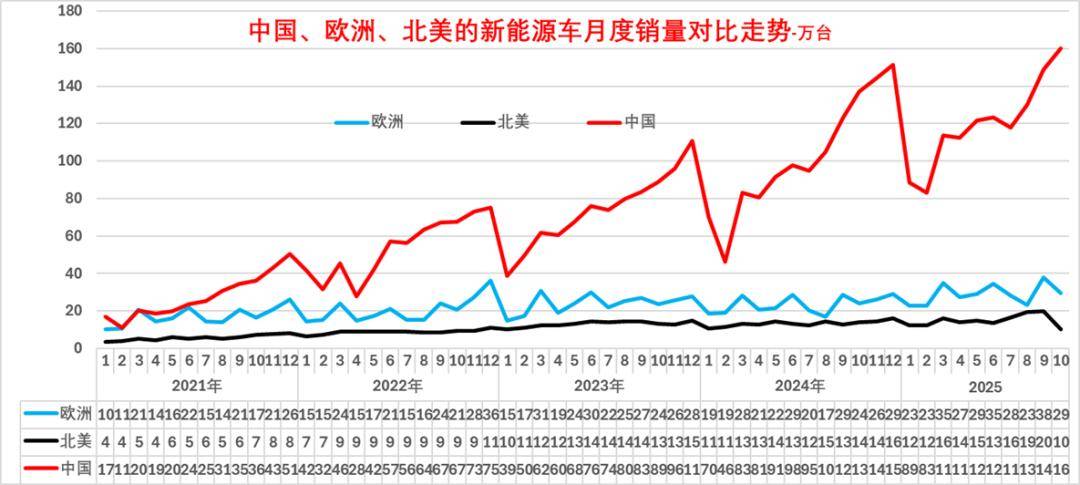 從新能源車的區(qū)域市場走勢看,2020年歐洲始終是加速上行,超越中國。2021-2025年的歐洲新能源車市場總體高位平穩(wěn)增長,而中國新能源車市場近幾年持續(xù)走勢強勁。