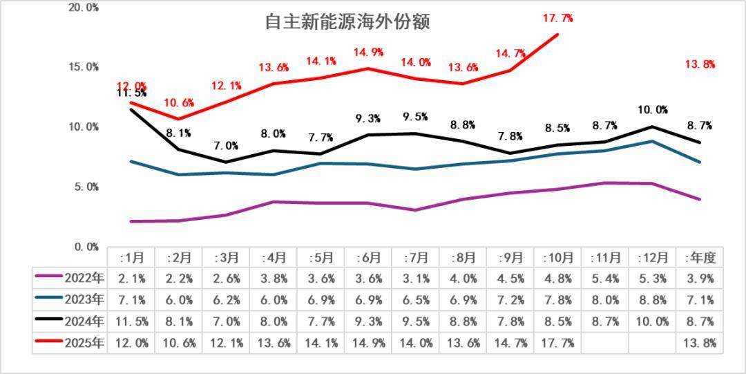 2025年10月自主新能源乘用車海外市場銷量份額17.7%,環(huán)比9月提升3個百分點。由于自主新能源出口表現(xiàn)較好,而美國變化大,因此自主新能源乘用車海外市場銷量份額從2024年的8.7%,今年1-10月上升到13.8%的提升較大。