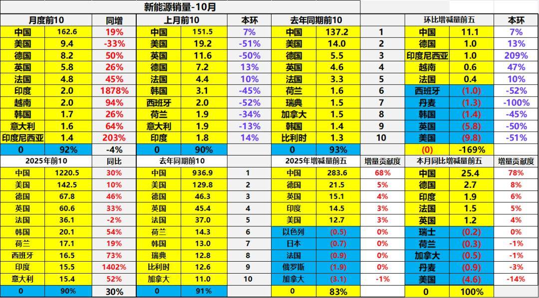 2024年中國新能源乘用車在世界的新能源乘用車增量貢獻(xiàn)度是78%,其它貢獻(xiàn)度較大的是:德國8%、印度6%、法國5%、英國4%,有較大增量貢獻(xiàn)。2025年1-10月份的世界新能源的增減量貢獻(xiàn)度中,中國占了68%,德國和英國各占了增量的5%和4%的貢獻(xiàn)度作用,所以整個世界新能源車總體的增量貢獻(xiàn)基本就是在中國。近幾年中國貢獻(xiàn)了世界7成左右的增量,中國車市是世界新能源車競爭的核心焦點。