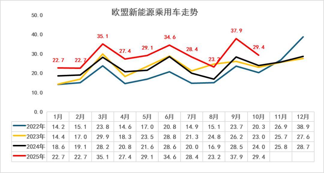 歐洲新能源乘用車今年1-10月銷量291萬臺,較去年同期增量65萬臺,增28%。初步統(tǒng)計歐洲新能源乘用車10月29.4萬臺、同比增22%。