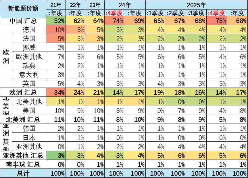 2021年全年的歐洲新能源市場受疫情影響,新能源增長較弱。2022年仍受到疫情影響,歐洲2022年較2021年份額下降較大,2023-2024年歐洲份額繼續(xù)小幅下降。2025年1-10月歐洲新能源的世界份額達(dá)到17%,較去年同期的份額基本持平。