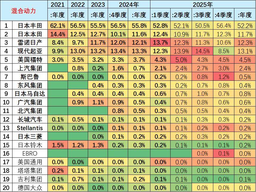混合動力市場是日韓強勢的占據(jù),豐田、本田、日產(chǎn)和現(xiàn)代的混動表現(xiàn)很強,2025年占據(jù)90%,其它大部分企業(yè)的混動份額均不超過1%。近期豐田和馬自達(dá)在2025年的混動市場份額表現(xiàn)較好。上汽名爵的混合動力在歐洲市場表現(xiàn)也很好。