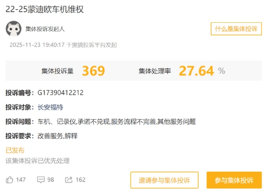 就在同一天,超過360名蒙迪歐車主在投訴平臺發起集體維權,另有超過200名銳界L車主也加入維權行列。他們的核心訴求直指老款車機系統嚴重卡頓問題。
