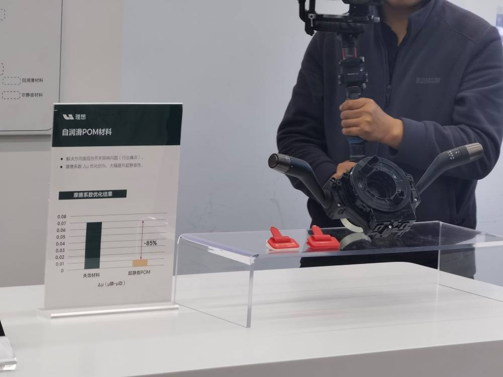 圖中是理想汽車應用在方向盤組合開關上的的自潤滑POM材料,可以解決方向盤組合開關異響的問題,摩擦系數大幅優化,提升靜音性。