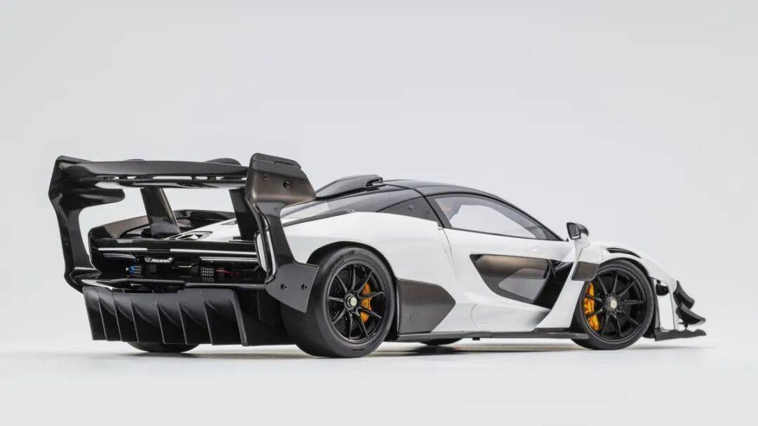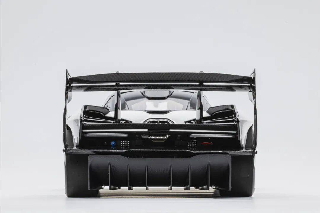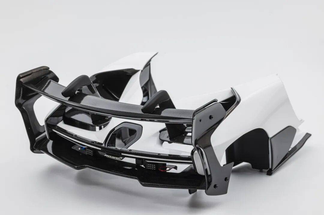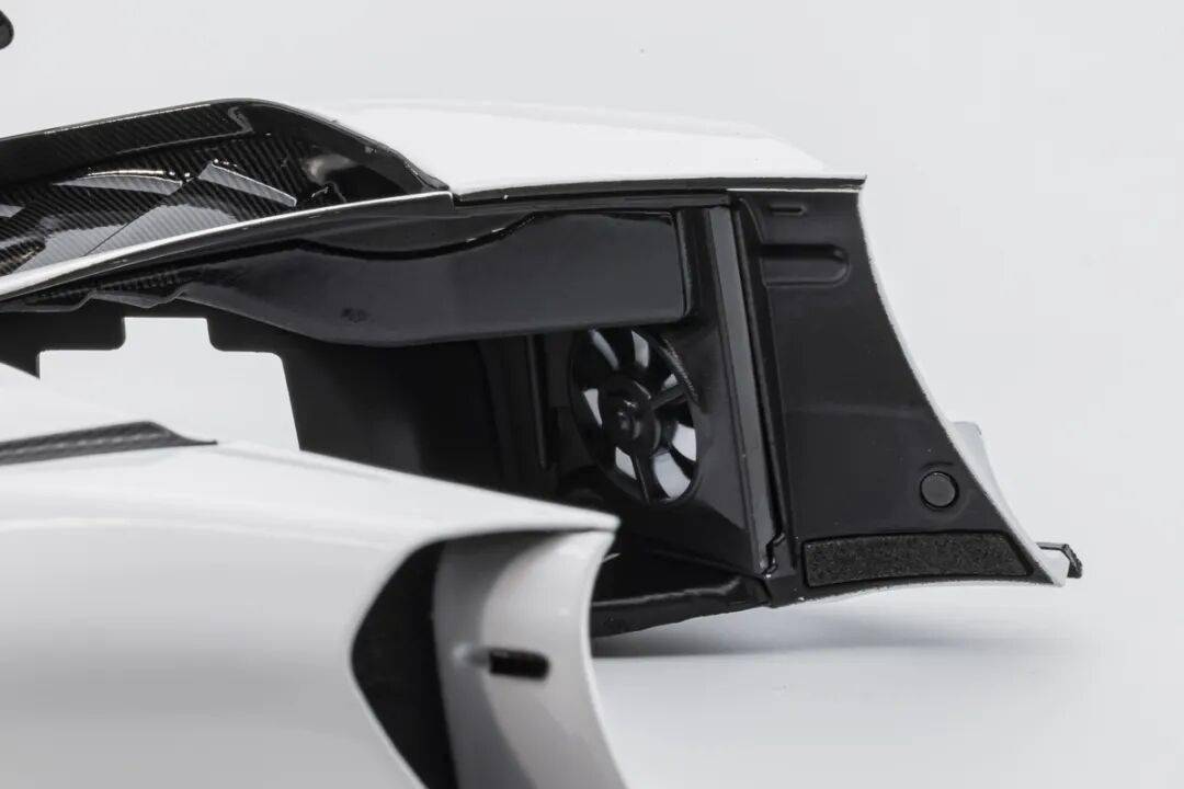 SENNA GTR的車尾有較大面積的通風(fēng)設(shè)計,尾燈旁邊的通風(fēng)口也是真實鏤空的。兩出的排氣管采用獨立件金屬件,位置放在SENNA GTR的后蓋后側(cè)。車尾有賽車的后警示燈,還有支撐起車身(用于換輪胎)的充氣口。車尾有多層尾翼,而且都是覆蓋了碳纖維的,還有紅色的拖車環(huán),這個也是金屬材質(zhì)的。車尾的MCLAREN標(biāo)志為懸空結(jié)構(gòu),標(biāo)志為金屬蝕刻片。尾部擴散器風(fēng)刀還原度較高,尾翼的結(jié)構(gòu)復(fù)雜,還原度也比較高。SENNA GTR有超級夸張的尾翼,尾翼整體都是用碳纖維貼紙覆蓋的,而且還原了復(fù)雜的多層結(jié)構(gòu),尾翼的支架也還原到位,兩側(cè)還有金屬材質(zhì)的尾翼側(cè)風(fēng)刀,這個風(fēng)刀一直連接到車身上。