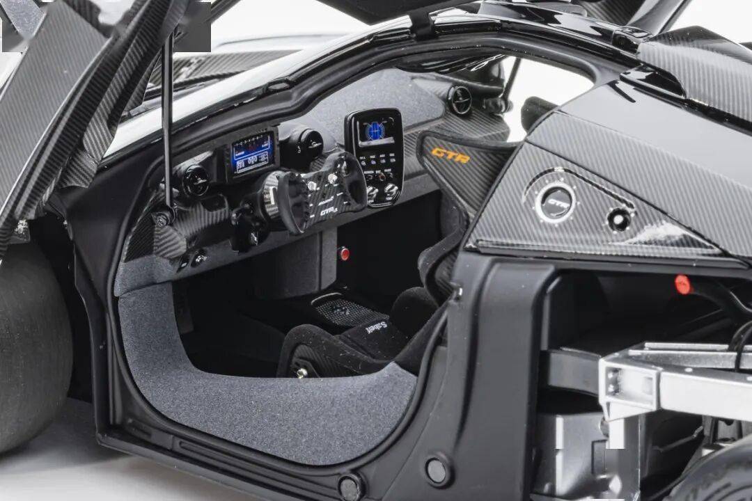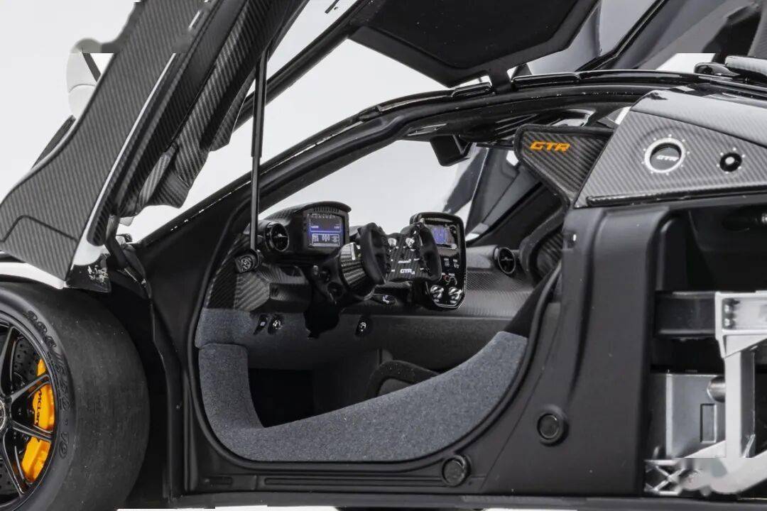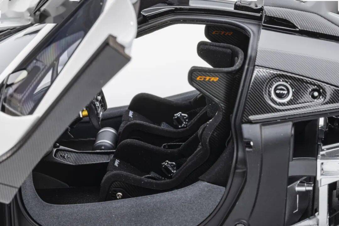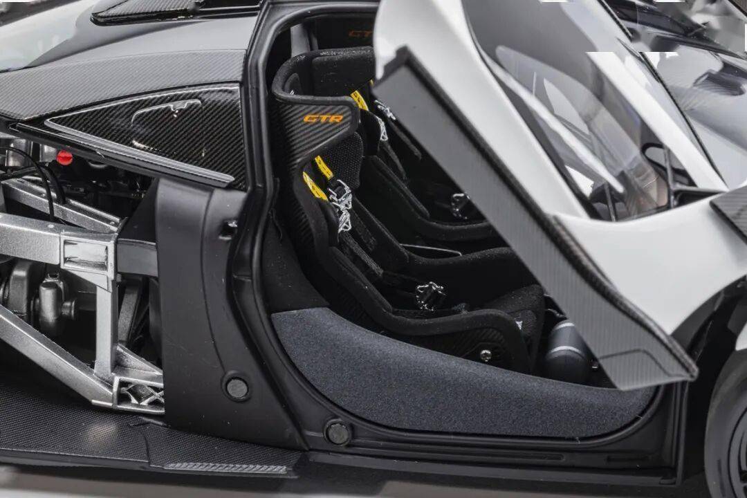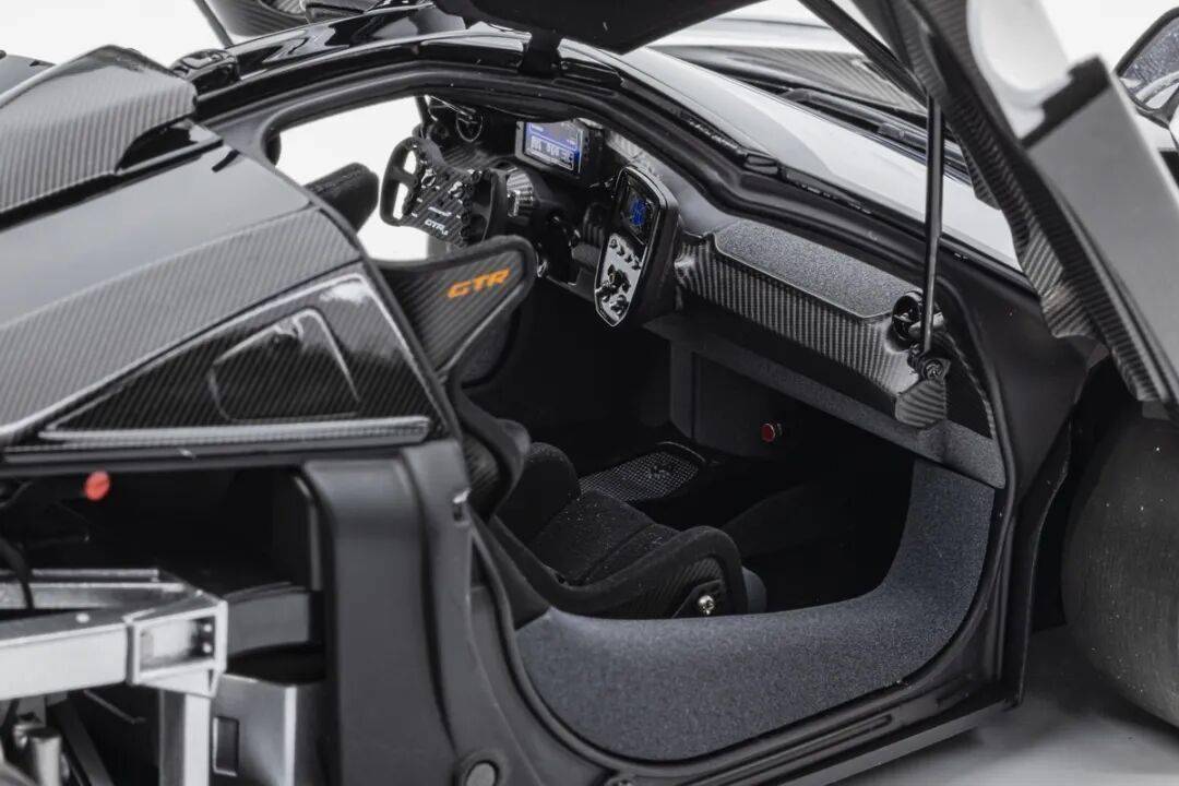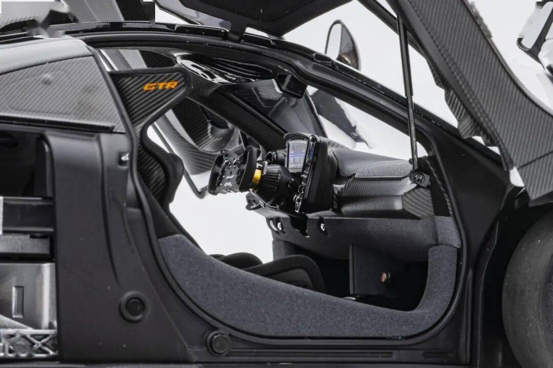 SENNA GTR基本上就是一款賽車,有很多賽車專用的細(xì)節(jié),模型還有還原四點安全帶。座椅后方應(yīng)該是整體貼碳纖維貼紙的,整個駕駛艙基本都是覆蓋了碳纖維貼紙,做工非常用心,駕駛艙地板貌似也是做了植絨的,乘客座椅前還有滅火筒,這個位置估計也不會坐人。模型的車門為蝴蝶門,開啟角度還行,內(nèi)部也是覆蓋了碳纖維的。
