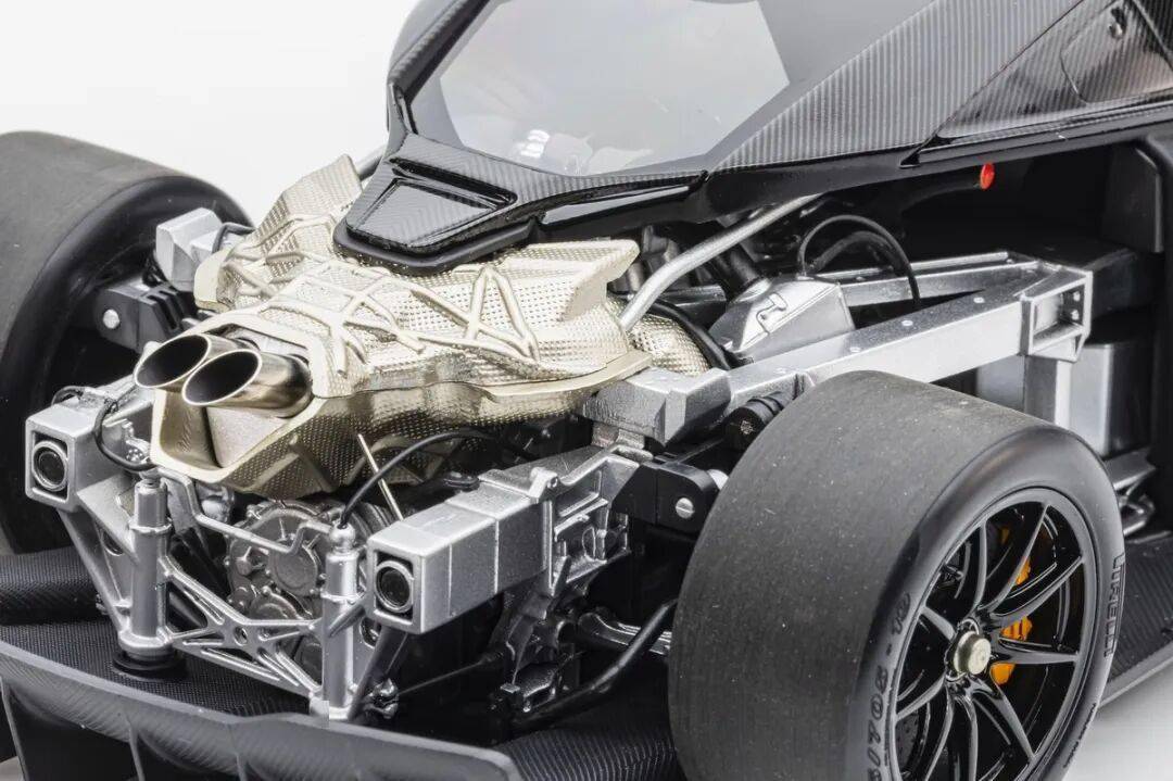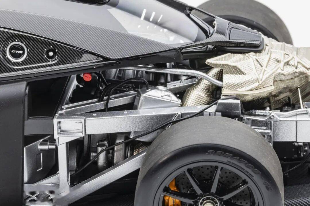 模型的后車身蓋子可以整體取出,取出后可以觀察到整個發(fā)動機、排氣系統(tǒng)和懸掛系統(tǒng)結(jié)構(gòu),LCD這款SENNA GTR模型的懸掛結(jié)構(gòu)式真實還原兼可動的。不過發(fā)動機整體質(zhì)感偏塑料,這點上和之前的HUAYRA R有一定差距,不過金屬的排氣管質(zhì)感確實不錯。