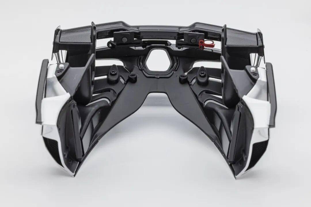 模型的后蓋結(jié)構(gòu)更為復(fù)雜,通風(fēng)口也都是真實鏤空的,還有風(fēng)扇細(xì)節(jié)刻畫。尾翼橫翼結(jié)構(gòu)復(fù)雜,模型還原度也很高,細(xì)節(jié)很豐富。后蓋內(nèi)側(cè)也是全部覆蓋碳纖維貼紙,同樣是左右對稱的。