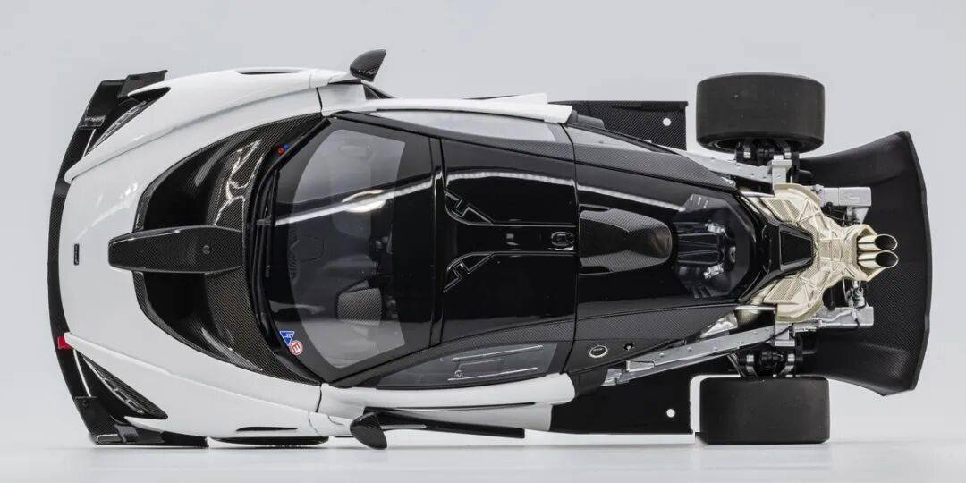 模型的漆面整體水準(zhǔn)較高,碳纖維貼紙工藝也非常成熟,縫隙控制的也很好,全車覆蓋的碳纖維都是左右對稱的。取走前后蓋后,整個內(nèi)部結(jié)構(gòu)暴露無遺,雖然比不上HUAYRA R,但是整體上已經(jīng)相當(dāng)不錯了。