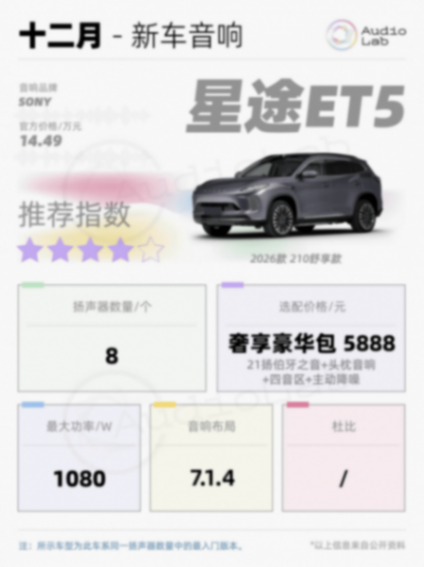 別人都是標配國產自研,選裝升級才能獲得品牌音響。而星途ET5卻反向操作,標配8個揚聲器的SONY音響,選裝升級后獲得21個揚聲器的國產音響“伯牙之音”,并且支持7.1.4全景聲。
