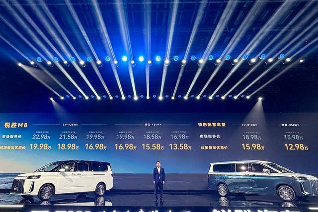 12月5日,銳勝M8迎來了正式上市,新車在共計推出8款車型的情況下,給出了15.98萬元-22.98萬元的市場指導價區間,鎖單搶先價則為14.98萬元-21.98萬元,政策疊加優惠價為12.98萬元-19.98萬元。主攻15-20萬元商用及家用MPV市場。動力系統擁有增程、純電可選。