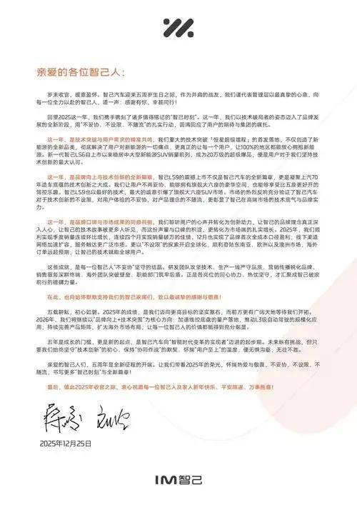 這一天,智己汽車CEO蔣峻與智己汽車聯席CEO劉濤聯名向全體員工發布了一封內部信。信中寫道:2025年,智己汽車實現季度銷量連續環比增長,連續4個月實現單月銷量破萬輛,12月份實現品牌首次全成本口徑盈利。