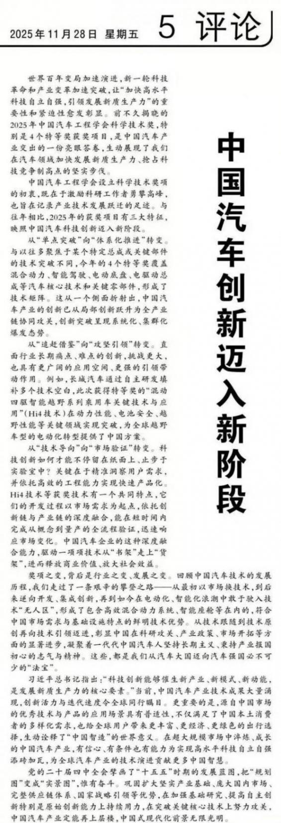 2025年,長城汽車多次登上《人民日報(bào)》,從7月頭版報(bào)道自主研發(fā)成果,到8月國際版點(diǎn)贊高質(zhì)量出海,再到11月評論版院士署名力挺Hi4技術(shù),其頻率之高、規(guī)格之重,在中國汽車企業(yè)中實(shí)屬罕見。