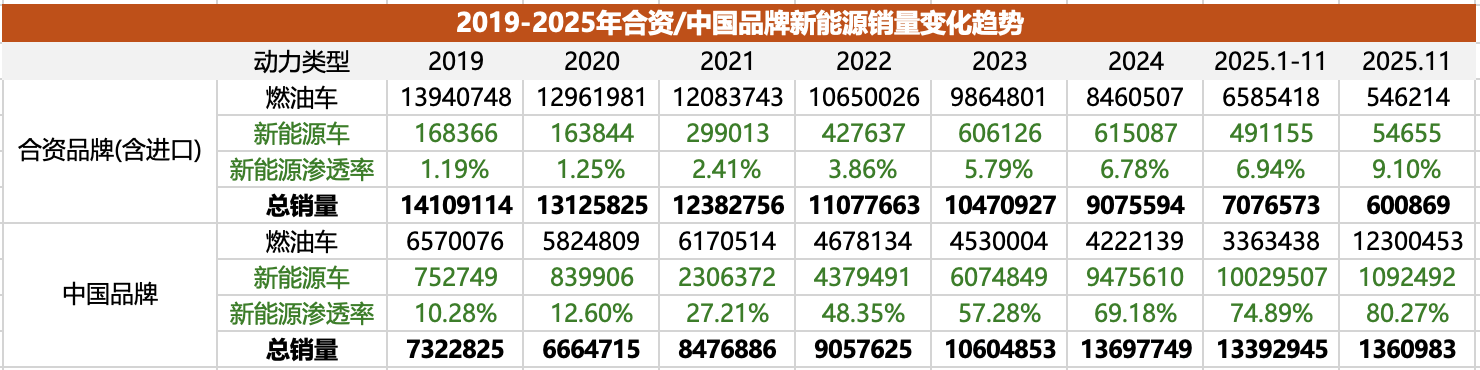 也就是說,在過去幾年里,合資陣營的新能源車不但基數更小,增長勢頭也遠不及自主品牌,且2024—2025年期間又明顯減速,整體勢頭看似萎靡。