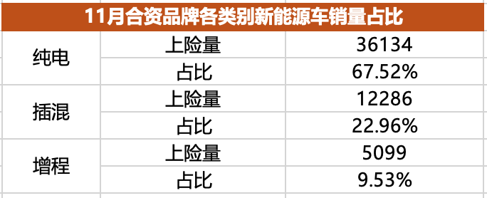 需要指出的是,這里海外品牌囊括了獨資的特斯拉,如果把其去除,只看傳統海外品牌的話,11月份新能源車總銷量只有5.47萬輛,不及特斯拉一家的規模,在總體新能源市場中的占比,只有4.5%。