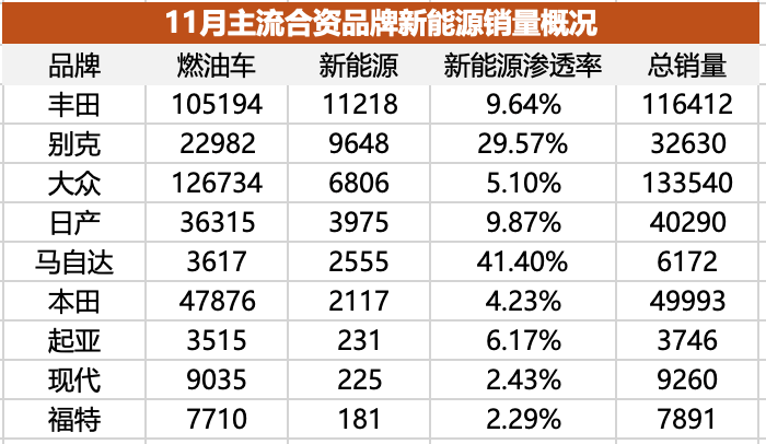 滲透率方面,主流合資品牌中最突出的是別克和馬自達,11月份分別達到29.6%和41.4%,但這兩個品牌本身的銷量基數較低,位于頭部的豐田品牌,新能源車滲透率已經達到9.6%,遠遠超過了大眾品牌的5.1%。