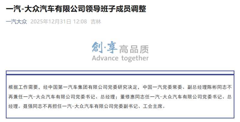12月31日,一汽-大眾發(fā)布一則人事調(diào)整公告。公告內(nèi)容顯示,陳彬不再兼任公司黨委書記、總經(jīng)理,該職位由原一汽豐田汽車銷售有限公司總經(jīng)理董修惠接任。與此同時,聶強(qiáng)不再擔(dān)任一汽-大眾汽車有限公司黨委副書記、工會主席。