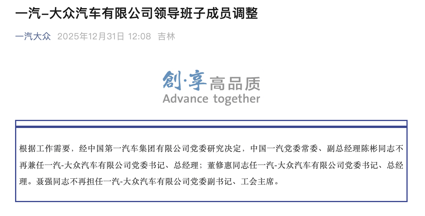 12月31日,一汽-大眾汽車有限公司領導班子成員調整。中國一汽黨委常委、副總經理陳彬不再兼任一汽-大眾汽車有限公司黨委書記、總經理;董修惠任一汽-大眾汽車有限公司黨委書記、總經理。聶強不再擔任一汽-大眾汽車有限公司黨委副書記、工會主席。