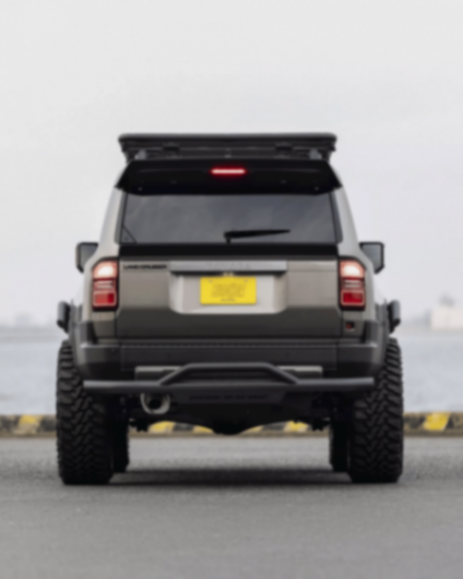 整車車身部件全面升級為鋼制套件,加裝了前后保險杠護杠、側踏板,以及直徑達70毫米的粗壯管狀輪眉。車輛頂部加裝了品牌定制底盤護板,既能保護車身底部,又能搭配全尺寸車頂行李架,架起一盞40英寸IPF LED長條射燈;車尾還配備了車頂擾流板延伸件和尾門專屬擾流翼。